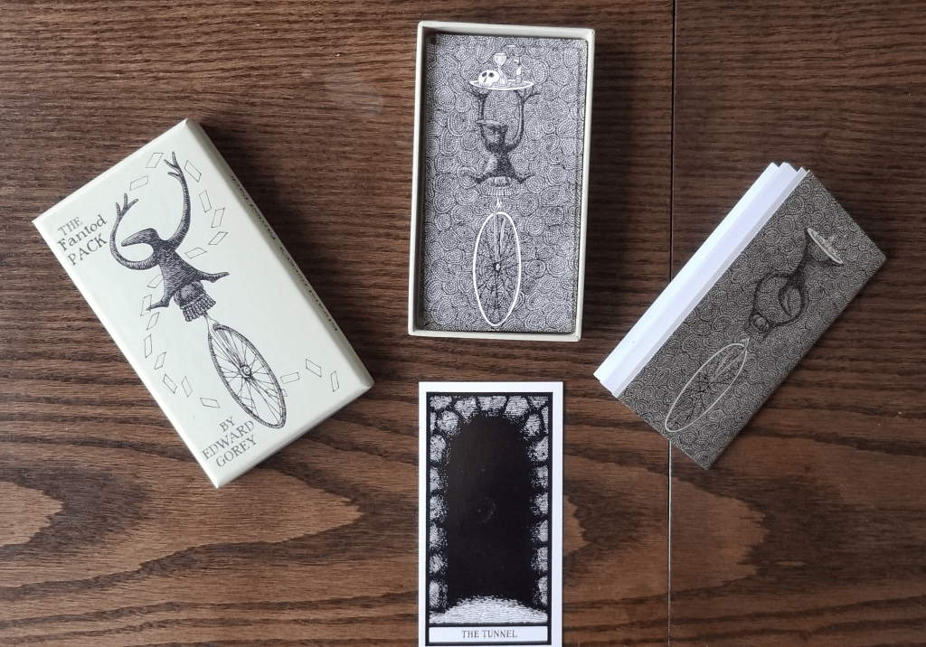 The Fantod Pack is a pack of alternative tarot cards created and illustrated by Edward Gorey, whom you may know from his iconic illustrations in an ominous, gothic style. Think classic literature like Dracula or the works of children’s author John Bellairs. Did you know that when someone demanded to know Edward’s sexual orientation, he said “I don’t even know,” and “Well, I’m neither one thing nor the other particularly. I suppose I’m gay. But I don’t really identify with it much.”? Yes, I read his Wikipedia page.